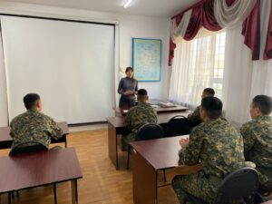ҚР Ұлттық Ұланы 6655 әскери бөлімінің тыңдаушыларымен “Менің мамандығым” тақырыбында сабақ өтті. Сабақ барысында тыңдаушылар өз таңдаған мамандықтары жайлы ой бөлісіп, қызметтік міндеттері мен болашақтағы кәсіби жоспарлары жөнінде әңгімеледі.Топ оқытушысы: З.Еспембетова