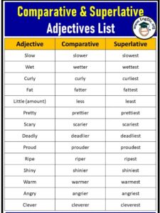 EnglishTime айдары: Comparative & Superlative Adjectives. Сапаларды салыстыру үшін comparative (–er) және ең жоғары дәрежені білдіру үшін superlative (–est) формаларын қолданамыз. Осы кесте арқылы күнделікті сөздердің өзгеруін есте сақтауға болады!